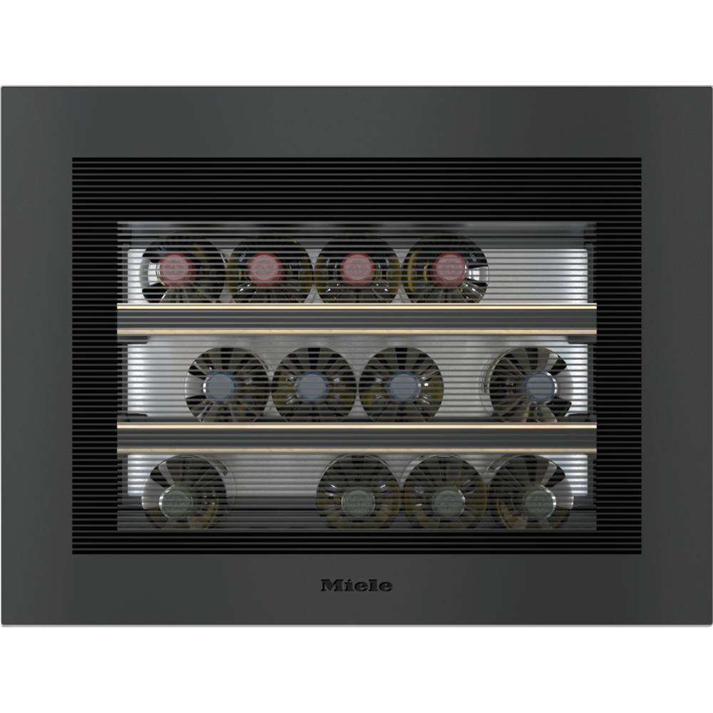 Weinkühlschrank von Miele mit drei Böden, gefüllt mit Weinflaschen. Schwarzer Rahmen, schwarzer Hintergrund.