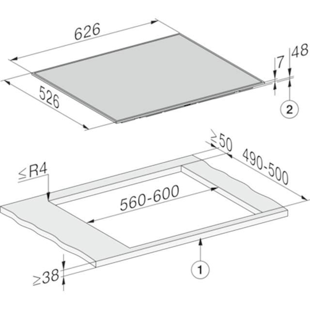 Technisches Schema einer Kochfeldplatte mit Maßen und Angaben zu Einbauhöhen und Abständen. Sichtbar sind Längen, Breiten und Radien.