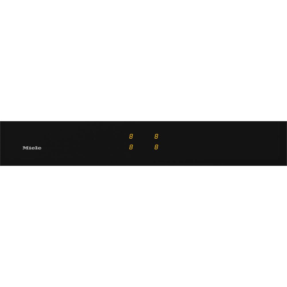 Schwarzes Induktionskochfeld von Miele mit vier Kochzonen und digitaler Anzeige. Rahmen aus Edelstahl.