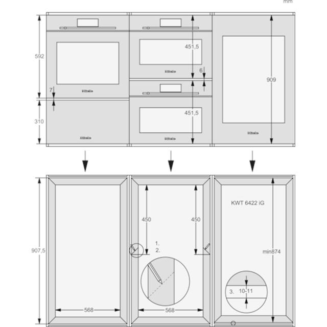 Zeichnung: Zwei Schrankelemente, jeweils mit runden Glasfenstern. Maße und Beschriftungen sind angegeben, inkl. „KWT 6422 IG“.