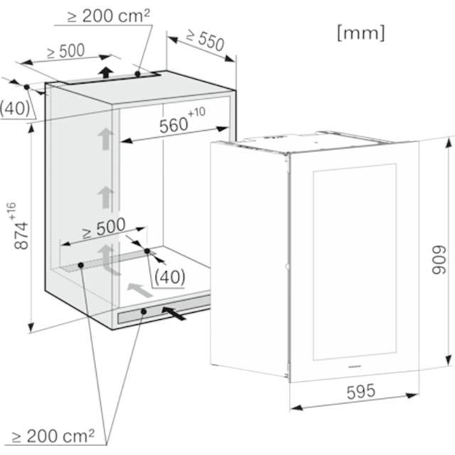 Zeichnung eines Kühlschranks, Ansicht von vorne und Seite mit Maßangaben in Millimetern, Höhe 874/906mm, Breite 595mm, Tiefe 560mm.