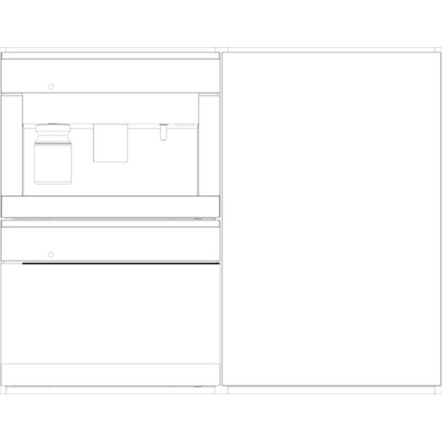 Kaffeemaschine mit Display und Schublade, rechts geschlossener Schrank. Einfache, lineare Darstellung in Grautönen.